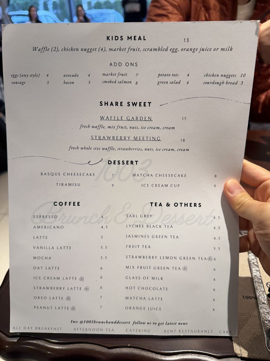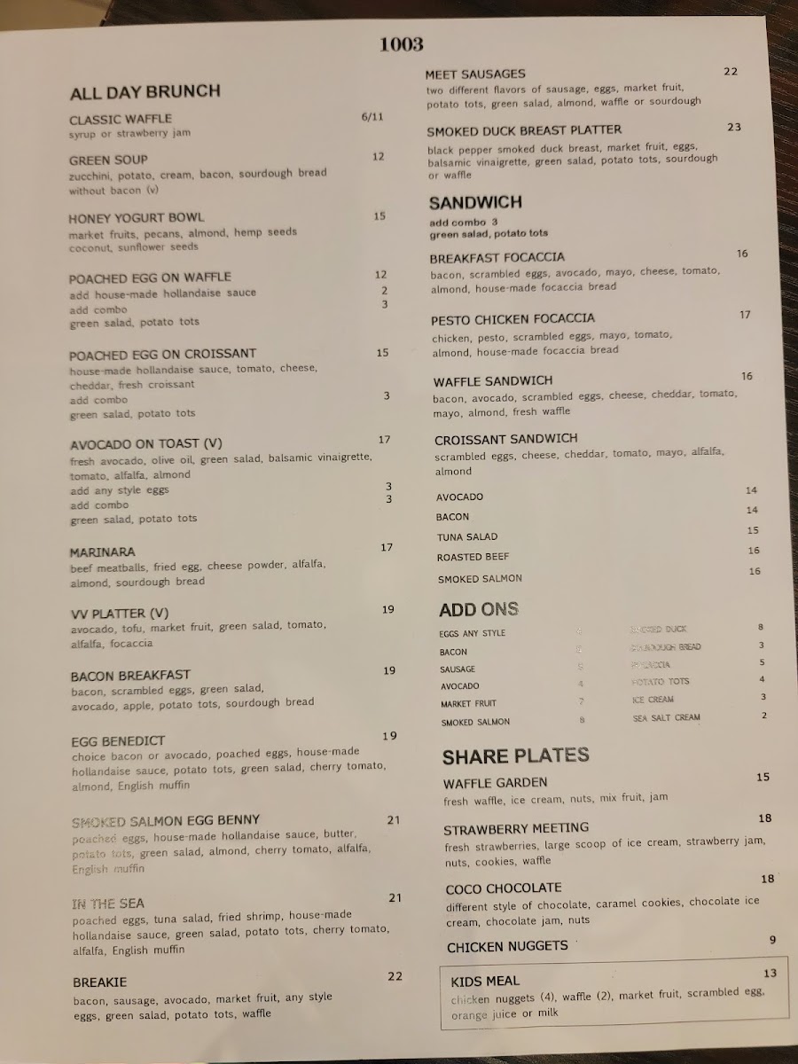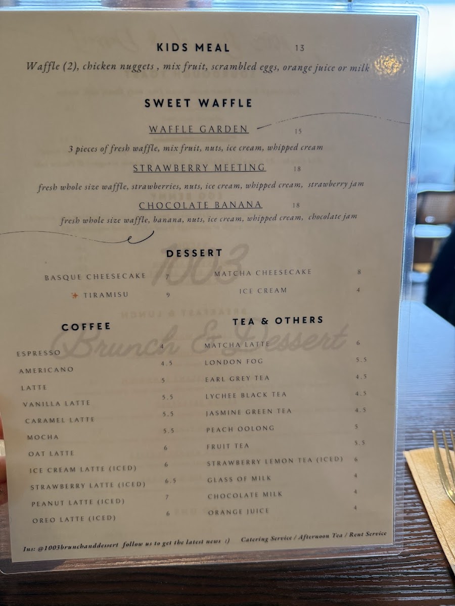 The menu at 1003 Brunch & Dessert offers a variety of options suitable for breakfast, brunch, lunch, and coffee breaks. It is organized into several main categories that include specialty lattes, croissant sandwiches, and shareable plates, along with other food and beverage selections.