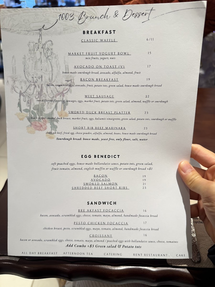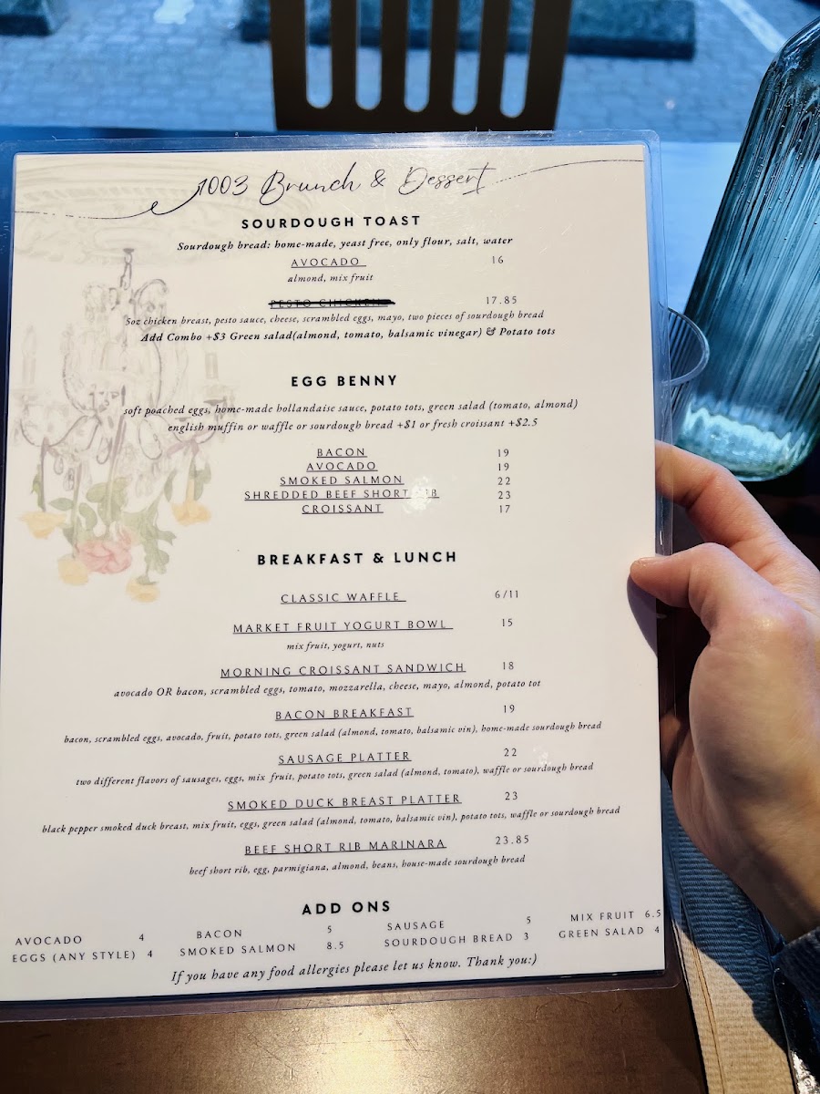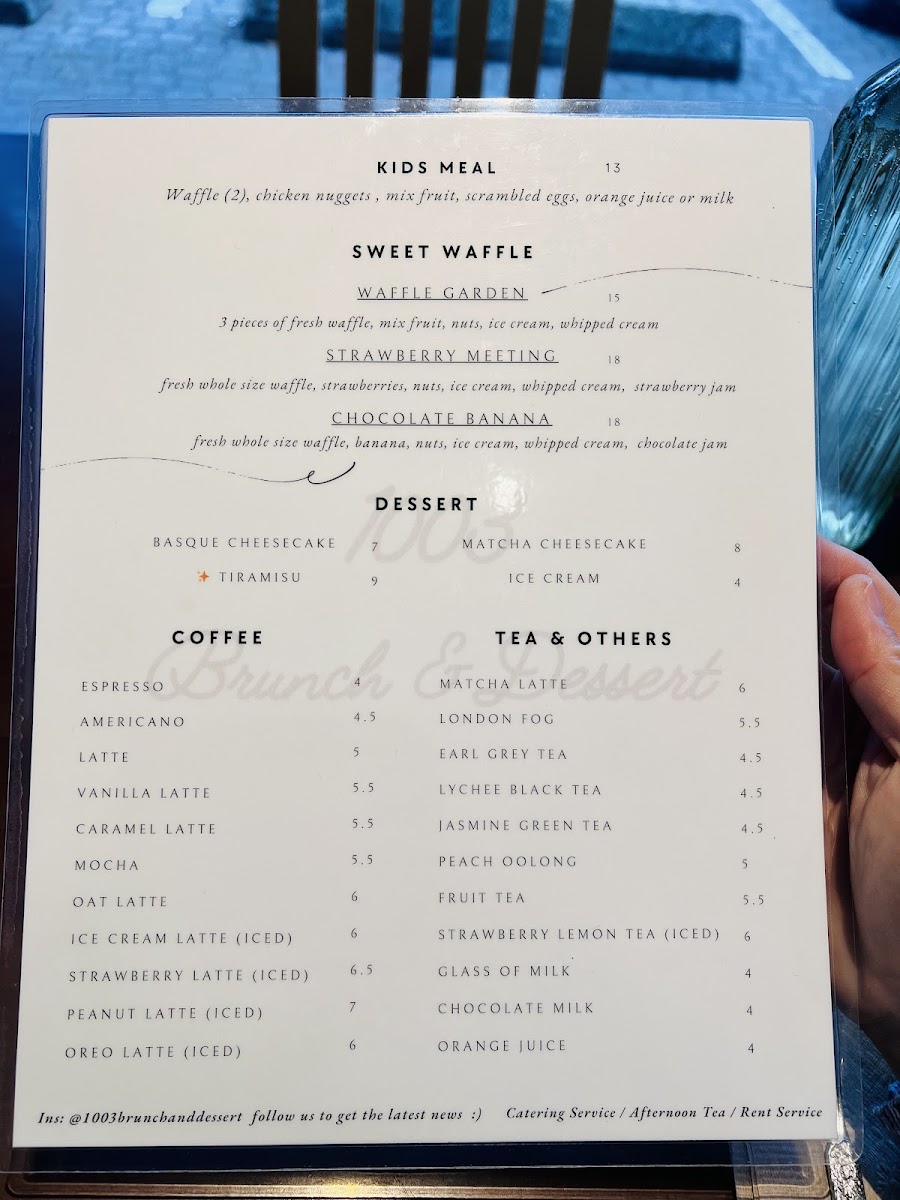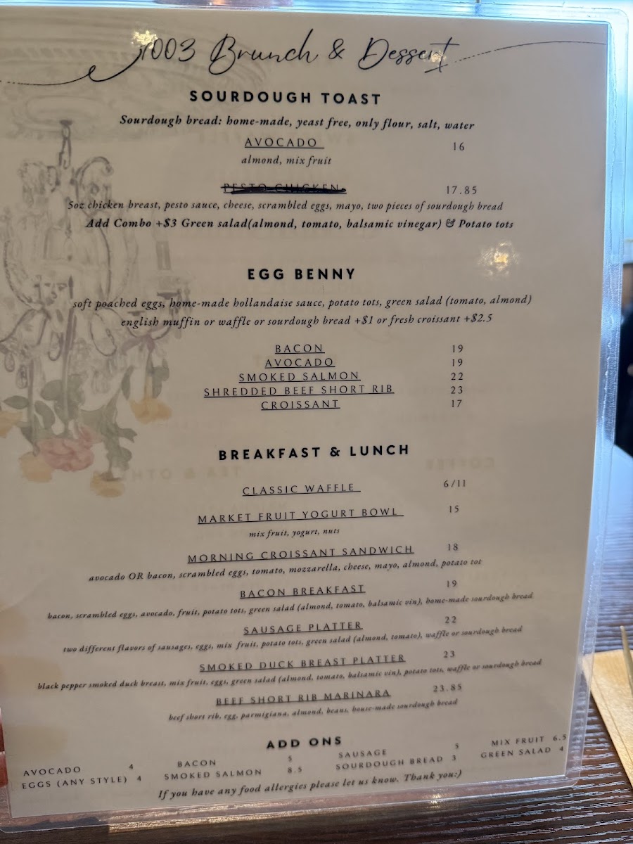 The menu at 1003 Brunch & Dessert offers a variety of options suitable for breakfast, brunch, lunch, and coffee breaks. It is organized into several main categories that include specialty lattes, croissant sandwiches, and shareable plates, along with other food and beverage selections.